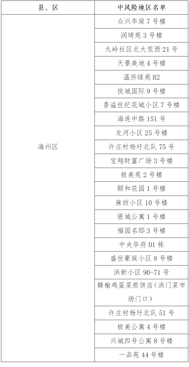 根據(jù)國務院聯(lián)防聯(lián)控機制有關(guān)規(guī)定,經(jīng)綜合評估研判,市指揮部決定,自發(fā)布之日起,將頤和花園1號樓、麻紡小區(qū)10號樓、銀城公寓1號樓、福園名邸3號樓、中央華府D1棟、盛世豪庭小區(qū)8號樓、洪新小區(qū)90-71號、贛榆雞蛋菜煎餅店(洪門菜市場門口)、許莊村楊圩北隊51號、極美公寓4號樓、興城四號公寓8號樓、一品苑44號樓調(diào)整為中風險地區(qū)。