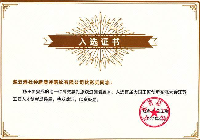根據省總工會部署要求,氨綸公司積極組織工匠人才參展。經評選,公司伏彩兵主要完成的《一種高效氨綸原液過濾裝置》創新成果入選大國工匠展伏彩兵入選首屆大國工匠創新交流大會江蘇展區重點展示科創推薦通道