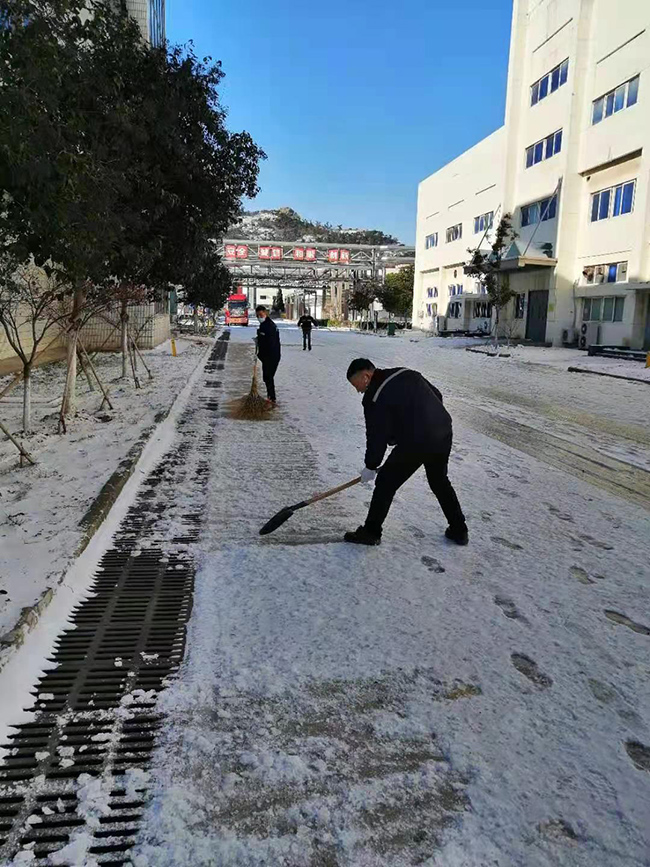 12月29日,港城迎來了2020年的第一場雪。白雪皚皚,北風呼嘯,廠區各個生產設施道路上都覆蓋上了厚厚的積雪。雖是一片銀裝素裹的美景,卻給廠內廣大職工的出行工作造成極大不便。為了保障公司安全穩定生產和員工出行道路安全,杜鐘氨綸公司黨委迅速組織開展了清除積雪大掃除活動。