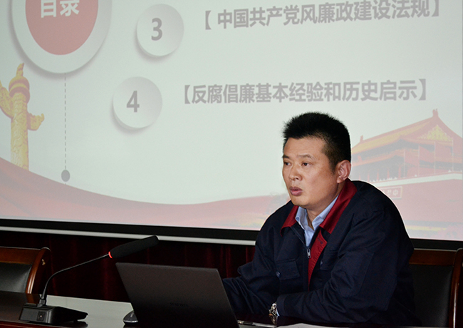 11月6日下午,杜鐘氨綸公司開展廉政黨課教育活動,黨委委員、紀委書記劉殿龍以《黨風廉政建設永遠在路上》為題,為公司黨員干部、全體管理人員上了一堂廉政黨課。