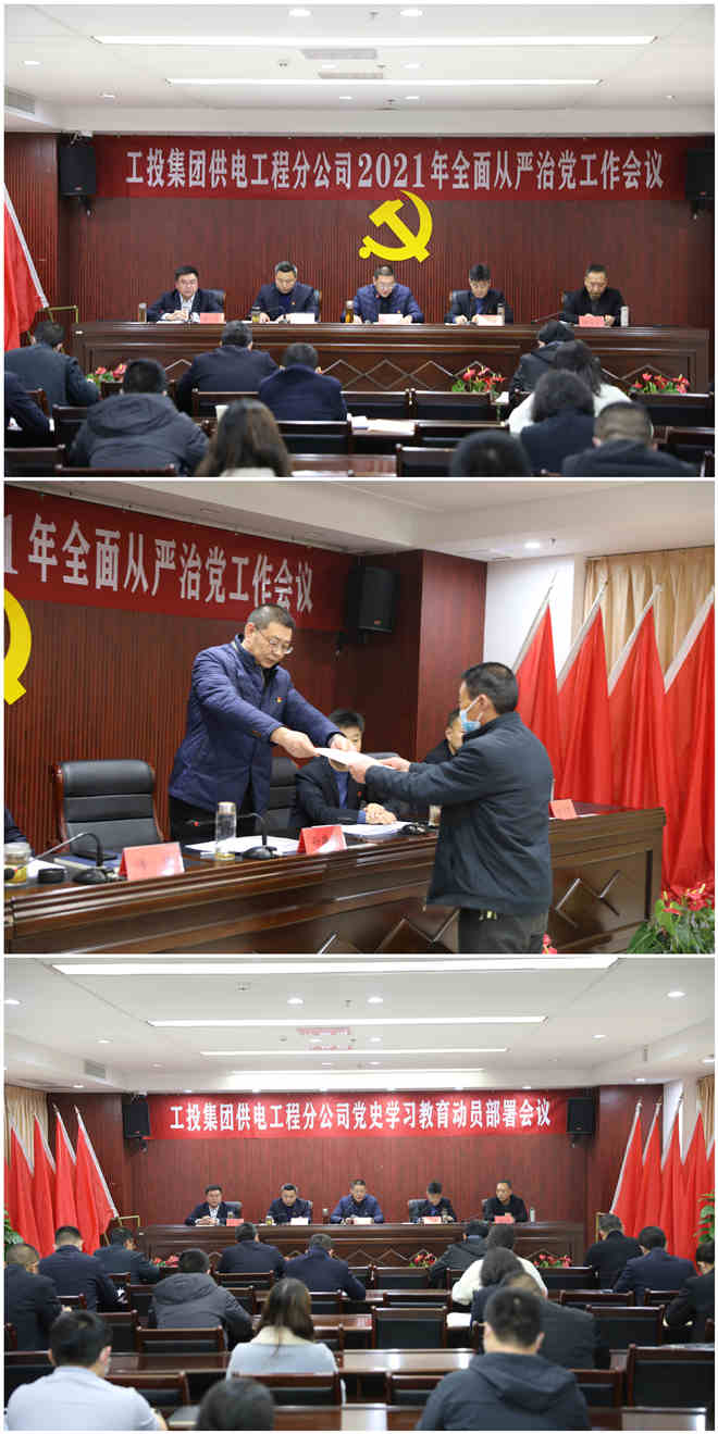 上半場,在公司2021年全面從嚴治黨工作會議上,全體參會人員首先觀看了全面從嚴治黨工作警示教育片。隨后,黨委書記、經理孫政權在題為《強化政治建設 聚焦深度融合 以大黨建引領公司高質量發展新征程》的黨委工作報告中指出,過去的一年,面對新冠疫情和經濟下行的雙重壓力,公司黨委深入學習貫徹習近平新時代中國特色社會主義思想,以“不忘初心、牢記使命”主題教育為主線,扎實開展“雙融雙創”黨內主題教育實踐活動,壓實管黨治黨責任、勇于直面困難挑戰,推動公司經濟在逆境中取得突破,黨建工作取得了顯著成效。報告強調,2021年黨委工作的指導思想是:深入學習貫徹習近平新時代中國特色社會主義思想、十九屆五中全會精神等內容,以“全面從嚴治黨”為統領,以“黨史學習教育”為主線,以打造“工電先鋒”黨建品牌為抓手,扎實開展“奮進新時代、領航開新篇”黨內主題教育活動,以“大黨建”整合力量、凝聚人心,發揮黨的關鍵引領作用,將黨的政治優勢轉化為發展優勢。團結帶領廣大干部員工,統一思想、凝聚力量,勇于擔當、開拓進取,加大改革創新、轉型升級、管理提升推動力度,開創工投供電高質量發展新局面,以改革發展優異成績向建黨100周年獻禮,為扛起“爭當表率、爭做示范、走在前列”重大使命、奪取“十四五”發展開局首勝作出貢獻。圍繞上述總體要求,重點做好五個方面工作:持續深化政治建設,推進黨建經濟深度融合;持續強化基層基礎,構建企業大黨建格局;持續推進人才隊伍建設,增強高質量發展推動力;持續推進黨風廉政建設,推進全面從嚴治黨向縱深發展;持續推進和諧企業創建,維護和諧穩定發展的良好局面。