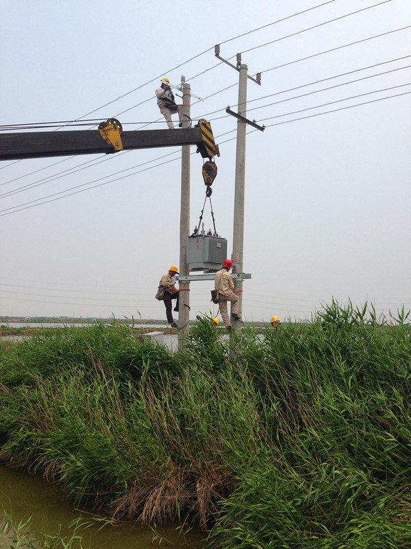 為了保證夏季高溫期,大新水庫2000畝淡水池塘配變盡快安裝到位。6月16日,該支部組織全體黨員開展了黨員奉獻日活動,全體黨員早晨7點鐘上班,工作近9小時,他們不怕天氣炎熱,不怕施工難度大,為職工做出了表率。圖為職工在施工中(宋忠文)