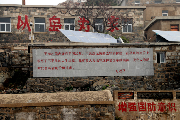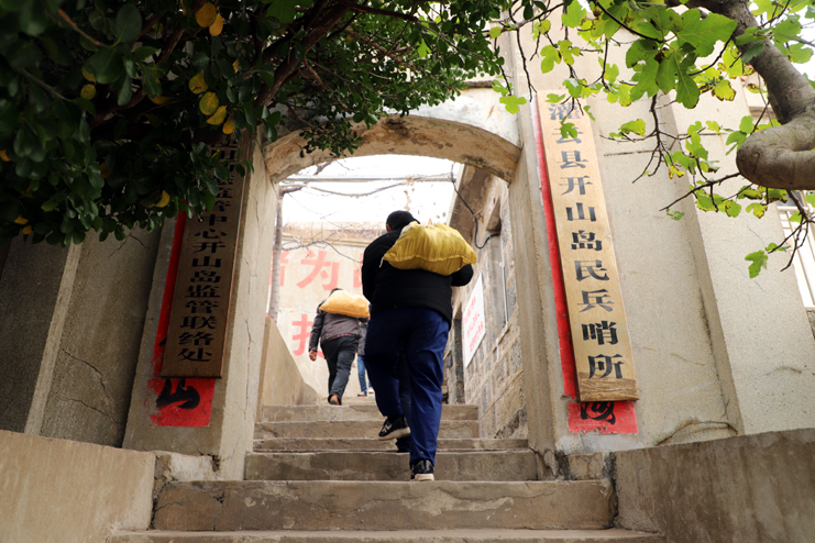 上午8點,在發動機巨大的轟鳴聲中,漁船緩緩駛離港口。近一個小時的顛簸,開山島出現在了視野里,由小到大,逐漸清晰。簡易碼頭上,守島民兵遠遠地沖著大家揮手,船上的人顧不上漁船的劇烈晃動,一個個扒著船沿熱情回應著,所有人的臉上都寫滿敬意和期待。漁船隨著海浪的節拍上下晃動著,班組長們登上碼頭,就緊緊握住守島民兵的手,對他們守島衛國,無怨無悔堅守和付出的愛國奉獻精神表示欽佩。班組長們跟隨著守島民兵沿著王繼才夫婦他們當年的巡邏路線,拾級而上,大家一邊感受巡島爬山的辛苦,一邊聆聽著守島民兵講解王繼才夫婦32年守島的艱難困苦和生離死別。