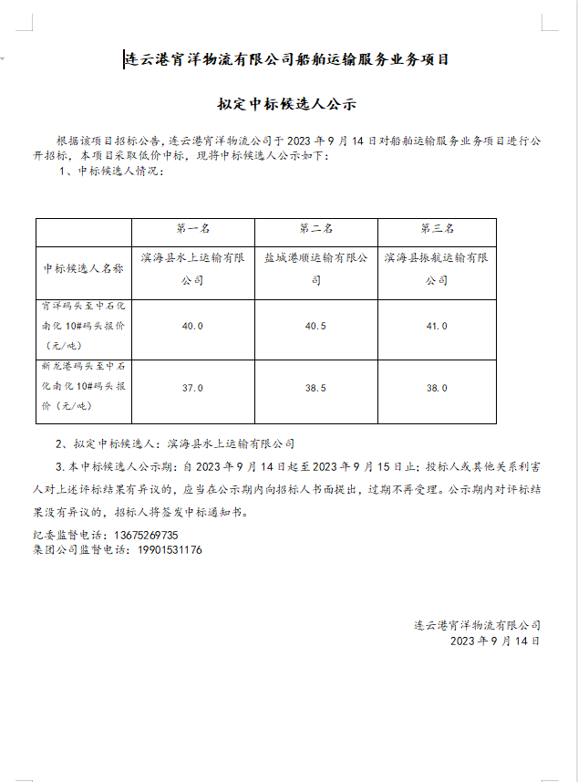連云港宵洋物流有限公司船舶運輸服務業務項目擬定中標候選人公示