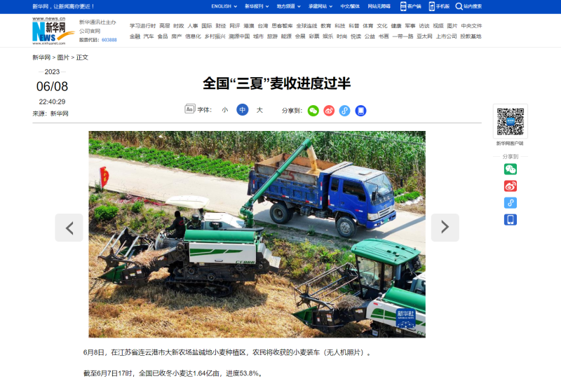 自6月8日麥收工作啟動以來,青口投資公司高度重視、精心組織,科學高效調動全方面因素,全力投入耐鹽堿小麥收割工作,開創了農業高質發展新局面,受到了中國政府網、人民網、新華社、新華網、連云港日報、蒼梧晚報等中央、省市級主流媒體的廣泛關注。(青 宣)