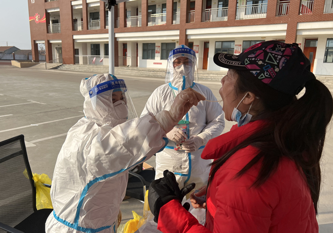 圖為黨員霍晶協助醫務人員對居民進行核酸采樣