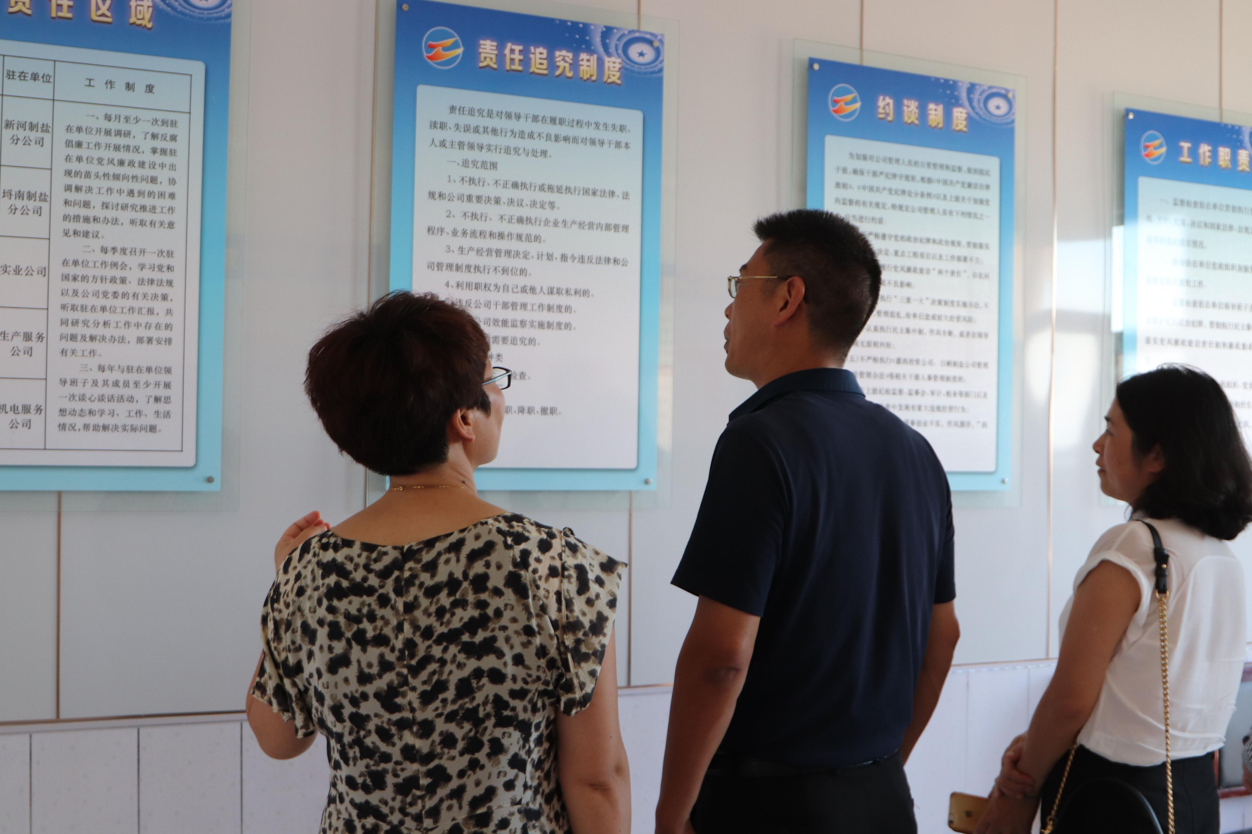 7月31日下午,神特公司與奧神新材料公司兩家紀檢干部結伴同行,前往灌西投資公司參觀學習。在灌西投資公司紀委書記王宏的陪同下,神特公司和奧神公司的紀檢人員參加了灌西投資公司經營單位片區第二季度黨風廉政發布會,聽取了二季度黨風廉政建設情況,隨后觀摩了新河、埒南、西旺等支部黨建活動室,日曬制鹽片區、灌西經營單位片區兩個派駐基層監察室,查看了紀檢工作臺賬,并一同觀看了廉政微電影《鹽光》。