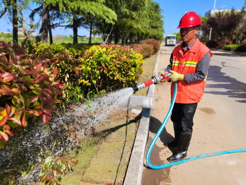 在各條基礎(chǔ)養(yǎng)護(hù)路段,綠化工人正在澆水,為花草樹木“解渴”。尤其是剛移植的苗木和剛出土的青苗,氣溫較高,容易造成脫水。通過適度澆水,保持土壤濕潤,促進(jìn)植物根系吸收土壤中的養(yǎng)分,有助于生長和扎根,提高綠化成活率。