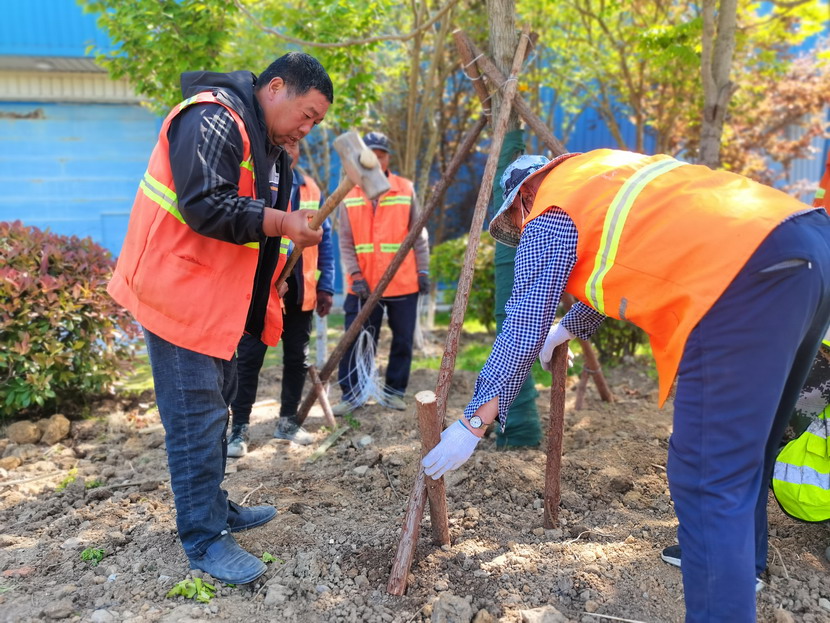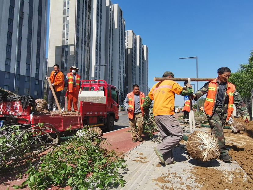 在中科院,只見工程車輛來來往往、橙色身影忙忙碌碌……到處都是一派繁忙、紅紅火火的景象。闖將孫玉虎,虎將金華穿梭在工程現(xiàn)場,親自指揮調(diào)度綠化工程收尾工作。大家分工有序:定點(diǎn)劃線、搬運(yùn)苗木、栽植澆水、垃圾清理……有條不紊。中午時分,熾熱的陽光照在臉上也是火辣辣的,忙碌了一上午的工人大汗淋漓,擰開瓶蓋,咕嚕咕嚕喝了幾大口涼水,用袖子蹭了下額頭的汗,又干勁十足地投入到工作中。
