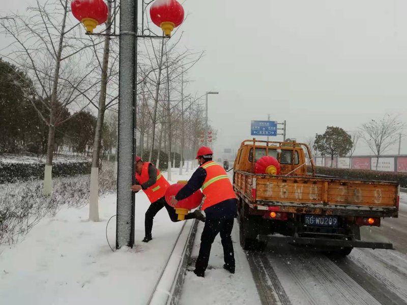 一夜的狂風暴雪將花果山大道路上的亮化燈籠刮掉不少,該項工程是翔立分公司今年承接開發區市政第一個亮化工程,安裝維護質量的好壞決定著這該項目工程的能否持續承接。帶著一份堅守、心懷責任、更帶著翔立轉型發展的希望,“鐵軍”們一大早就已經整裝待發,奔赴施工現場收集整理燈籠。