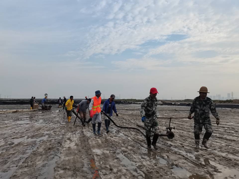 秋鹽開扒以來,海州灣公司上下所有干群,主動放棄節假日,晝夜奮戰在鹽池里。人工扒鹽三班倒,做到人停機不停;跟班人員24小時無縫銜接,確保時刻在扒鹽現場做好安全監管工作。目前,隨著堿廠關停的步伐加快,原鹽搶收工作進入到了決戰階段,在公司黨委的大力支持下,兄弟單位及機關各職能部門的火速馳援下,海州灣公司迅速啟動第二臺機械扒鹽管道,與人工扒鹽同步進行。公司領導與廣大職工想在一起、干在一起,上下齊心、爭分奪秒,擼起袖子、甩開膀子,在鹽池間盡情地揮灑著汗水,確保勞動成果顆粒歸倉,誓奪原鹽收官戰的勝利。